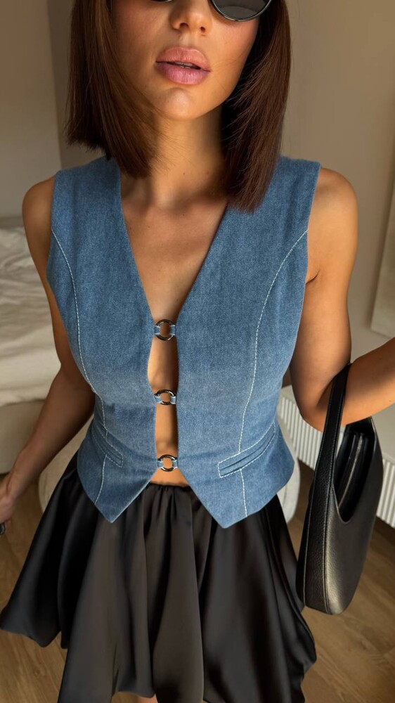 Жилетка з деніму "coss". приталений крій, v-подібний виріз та металеві кільця-застібки